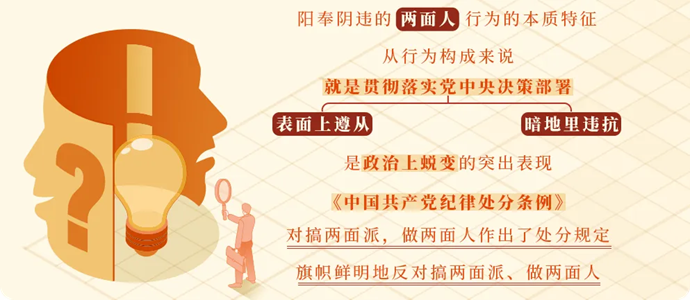 陽奉陰違的兩面人行為的本質特征,從行為構成來說,就是貫徹落實黨中央決策部署表面上遵從,暗地里違抗,是政治上蛻變的突出表現(xiàn)。