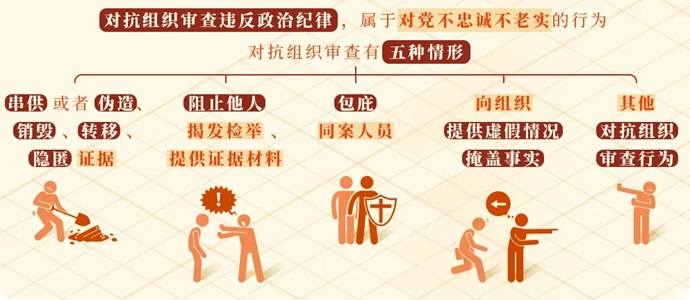 《中國共產(chǎn)黨紀律處分條例》第六十三條規(guī)定了對抗組織審查,應(yīng)予處分的五種情形:串供或者偽造、銷毀、轉(zhuǎn)移、隱匿證據(jù);阻止他人揭發(fā)檢舉、提供證據(jù)材料;包庇同案人員;向組織提供虛假情況,掩蓋事實;其他對抗組織審查行為。