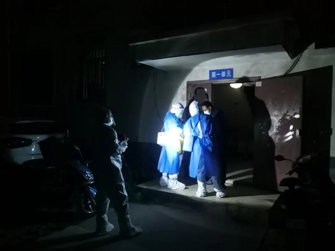 在做好防護準備后,扯起嗓門開始耐心的給即將入睡的百姓做起動員。在疫情期間,經(jīng)歷了漫長的等待,蝸居在家的市民大多習慣了早晚無序的核酸檢測,但還有不少以身體不適、經(jīng)不起“磨煉”等理由進行躲避、抗拒,隊員們不厭其煩,只能冒著風險逐戶登門做思想工作。舉燈踱步、排門逐戶做完檢測一眨眼三個多小時過去了,再做好試管封裝,數(shù)據(jù)統(tǒng)計、校對后已至子夜后半段,深秋微涼的晚風已被隊員的熱情牢牢抵御在防護服之外。