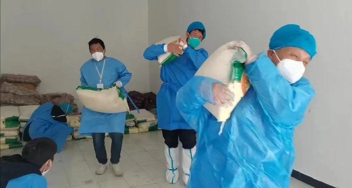 還來不及調(diào)整夜班后的身體疲倦,次日中午時分,志愿服務(wù)隊就收到了社區(qū)進行國慶政府慰問物資配送的通知。為保證社區(qū)居民能享受到最新鮮、及時的慰問物資,隊員們重打前一晚的雞血,頂著淅淅瀝瀝的小雨和感冒被感染的風險,再次手抓肩扛,將包裝完好的合計約5噸的糧油水果送到了居民手中。匆忙的腳步、簡單的交流,也讓社區(qū)百姓們漸漸讀懂了志愿服務(wù)隊的初心。
