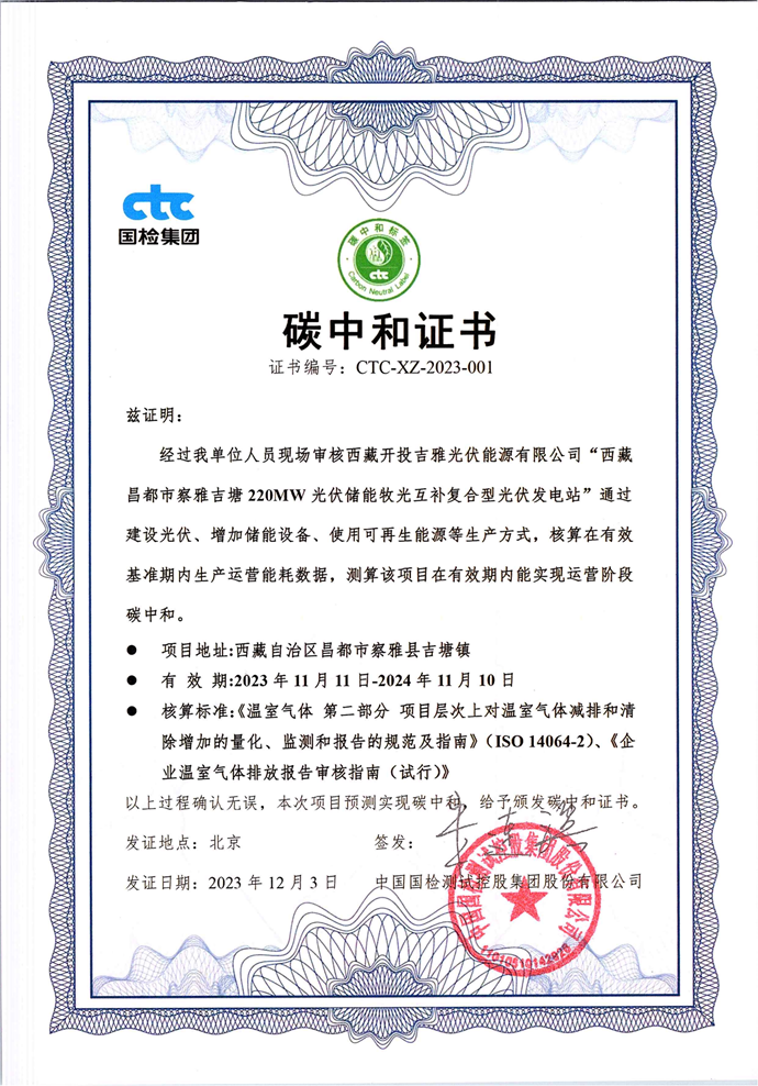 CTC國檢為吉塘200MW項目頒發(fā) “碳中和”證書
