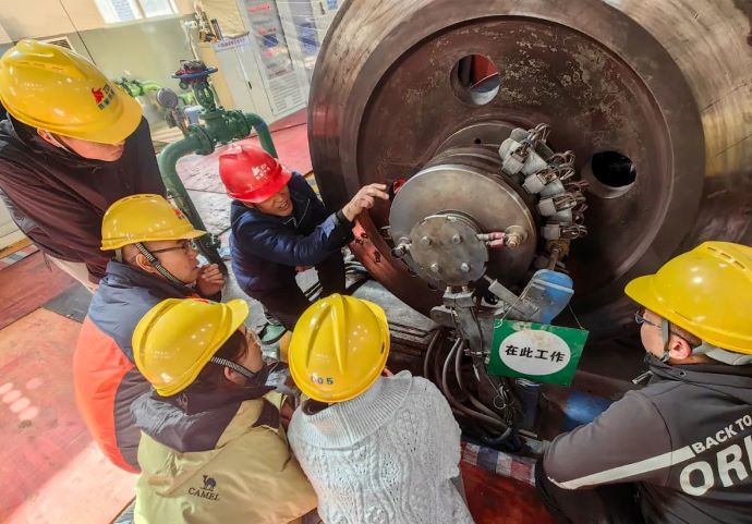 新員工在檢修現(xiàn)場了解水輪發(fā)電機(jī)組系統(tǒng)布置。