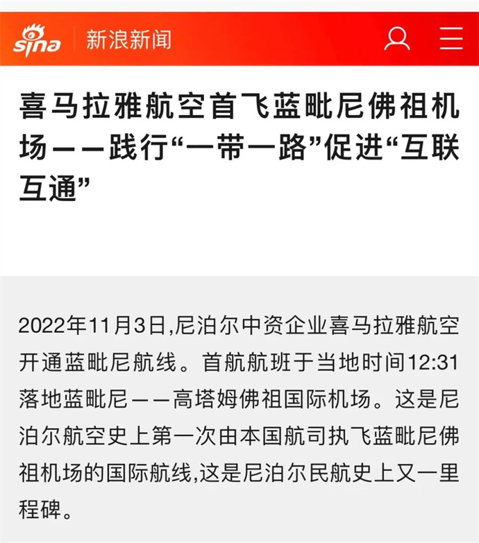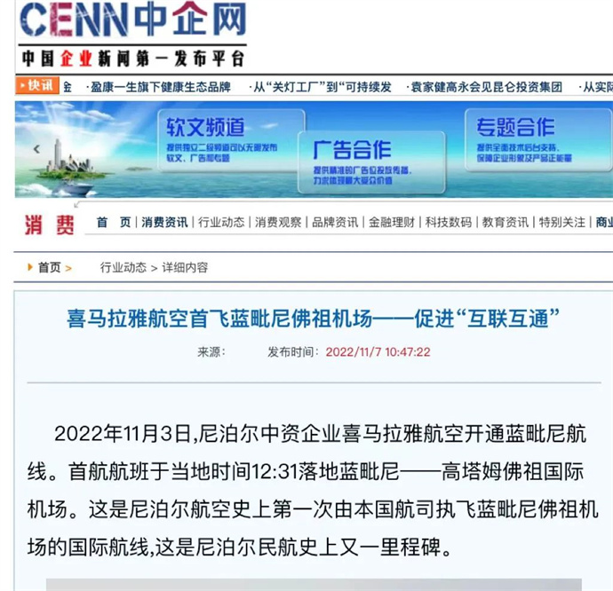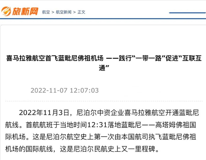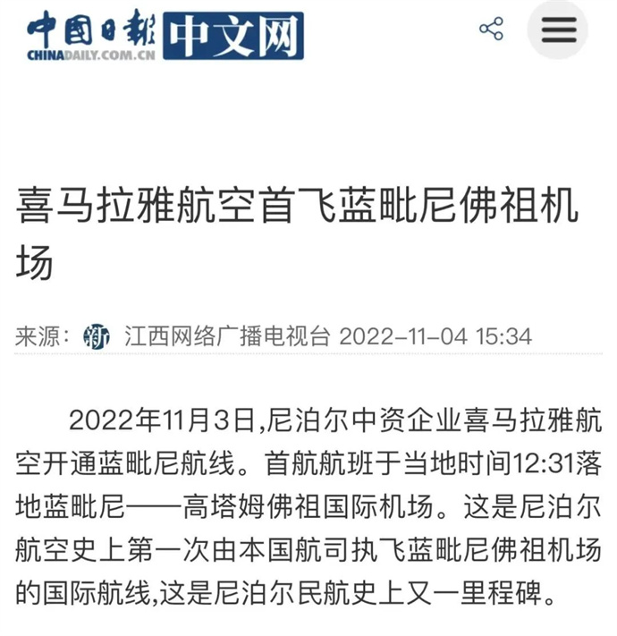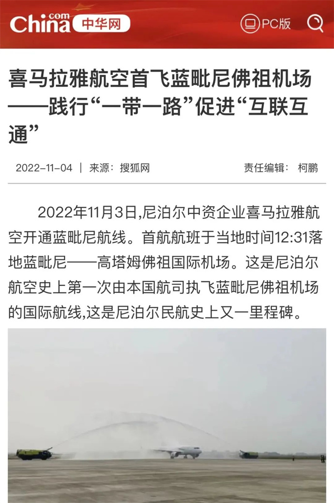 中華網(wǎng)、中國網(wǎng)、中企網(wǎng)、中國日報、光明日報、中國旅游新聞網(wǎng)、中國西藏新聞網(wǎng)、拉薩新聞網(wǎng)等媒體報道喜航開通加德滿都至藍(lán)毗尼航線