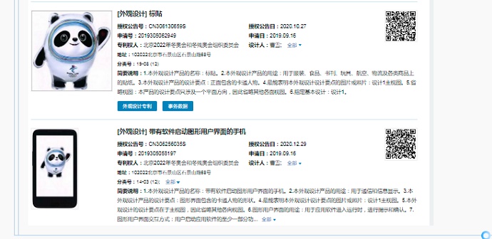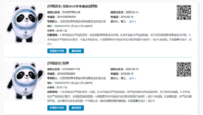 2019年9月,北京冬奧組委向國家知識(shí)產(chǎn)權(quán)局提交了4件與冰墩墩相關(guān)的外觀設(shè)計(jì)專利,并于2020年獲得授權(quán)。
