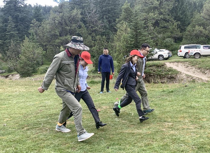 座談結(jié)束后,全體黨員面向黨旗莊嚴宣誓,重溫入黨誓詞,激勵永葆入黨初心。最后,兩支部開展了以“重溫紅色”為主題的戶外團建活動,通過重走長征路、黨建知識問答、紅色詞匯你比我猜、兩人三足等活動進一步增進支部交流互動?;顒蝇F(xiàn)場,參賽隊員充分發(fā)揚團隊精神,積極參與,精誠合作,加油聲、吶喊聲、歡呼聲此起彼伏。