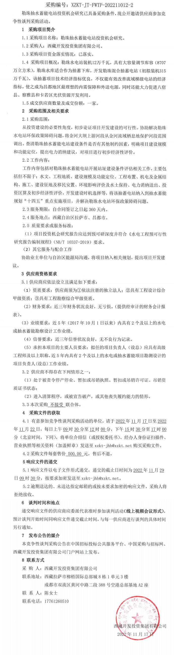 勒珠抽水蓄能電站投資機(jī)會(huì)研究競(jìng)爭(zhēng)性談判采購(gòu)二次公告