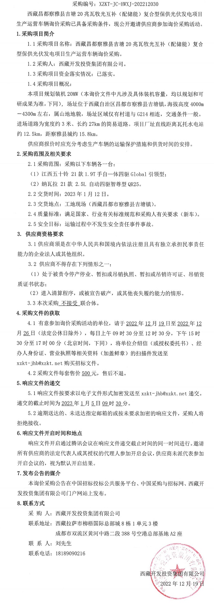 光伏發(fā)電項目生產(chǎn)運(yùn)營車輛詢價采購公告