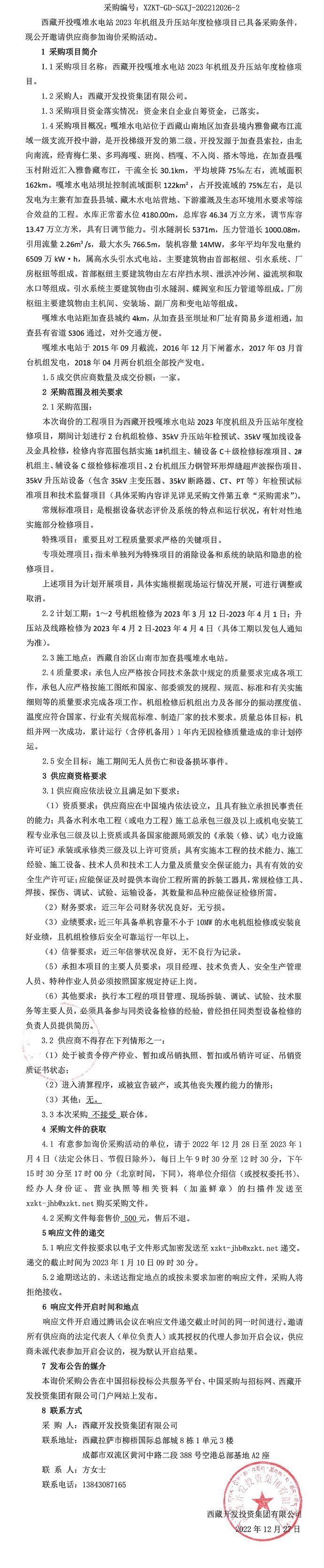 西藏開(kāi)投嘎堆水電站2023年機(jī)組及升壓站年度檢修項(xiàng)目詢(xún)價(jià)采購(gòu)二次公告