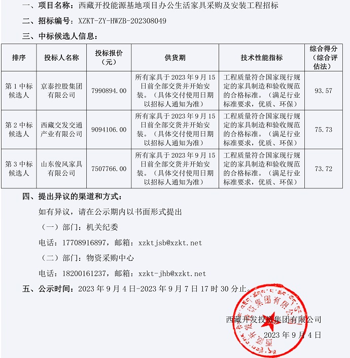 家具中標候選人公示
