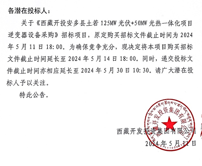 關(guān)于延長《西藏開投安多縣土若125MW光伏+50MW 光熱一體化項(xiàng)目逆變器設(shè)備采購招標(biāo)》購買招標(biāo)文件截止時間的公告