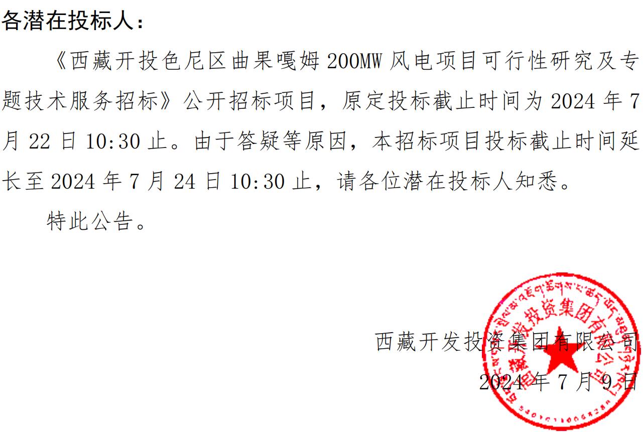 關(guān)于延長《西藏開投色尼區(qū)曲果嘎姆200MW風電項目可行性研究及專題技術(shù)服務(wù)招標》投標截止時間的公告