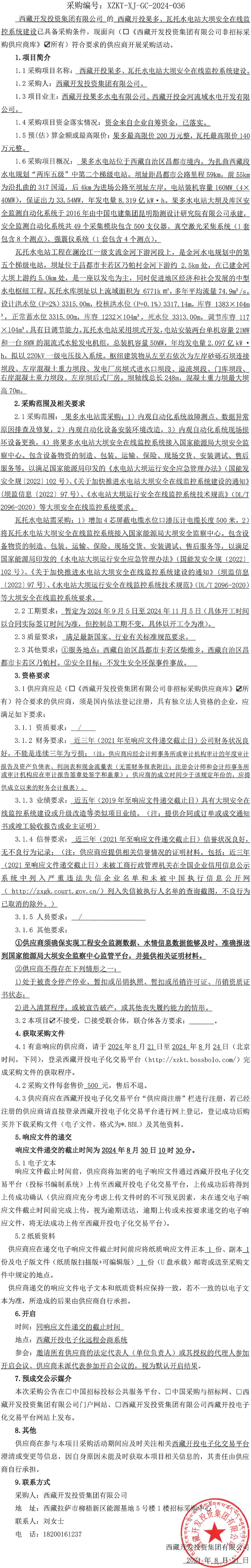 西藏開投果多、瓦托水電站大壩安全在線監(jiān)控系統(tǒng)建設(shè)詢價(jià)采購(gòu)公告